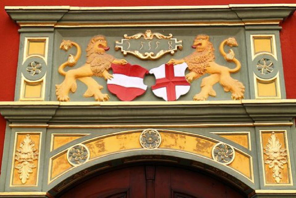 Gegenüber liegt das 1557 bis 1559 erbaute ziegelrote Alte Rathaus, das nach der Zerstörung 1944 im ursprünglichen Stil wieder errichtet wurde.