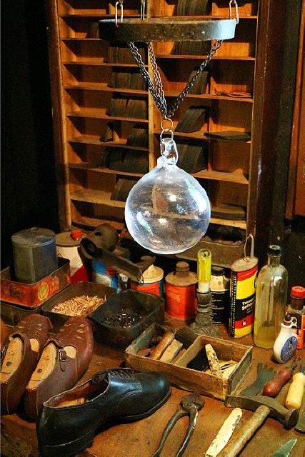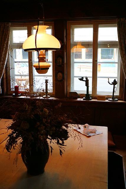 In unserer Stube sehen Sie eine Petroleumlampe, die für die notwendige Beleuchtung sorgte, über dem Tisch. Auch eine Petroleum Tischlampe ist vorhanden. Im Ofenwinkel hängen zwei Schulranzen aus Holz, Vorläufer unserer heutigen Schulranzen.
