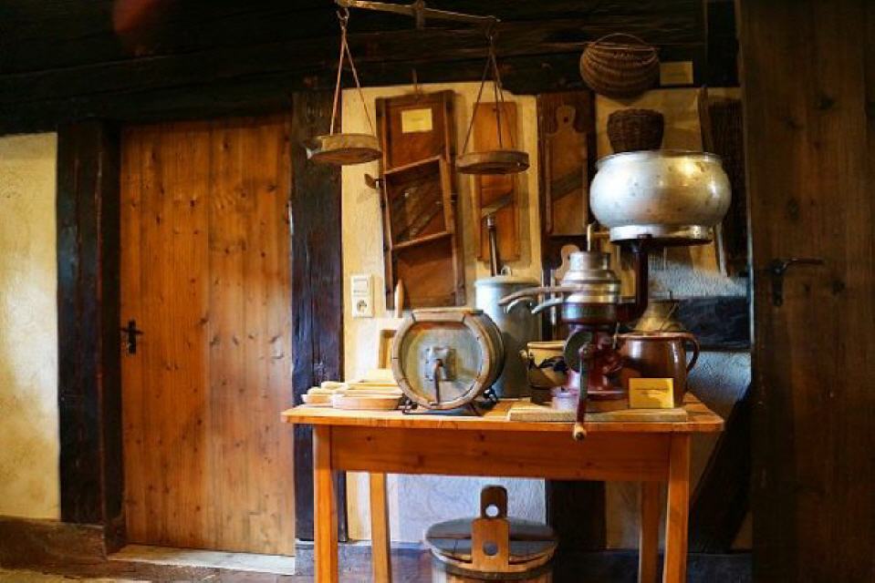 Im sogenannten Herrgottswinkei sehen Sie auf einem kleinen Podest eine Bibel an Stelle des sonst üblichen Kruzifixes, was in einer evangelischen Gemeinde üblich war. Ein kleiner Vogelkäfig ist noch erhalten, auf dem Kachelofen sind eine “Bettflasche” (auch Wärmflasche genannt), und ein Bügeleisen zu sehen.