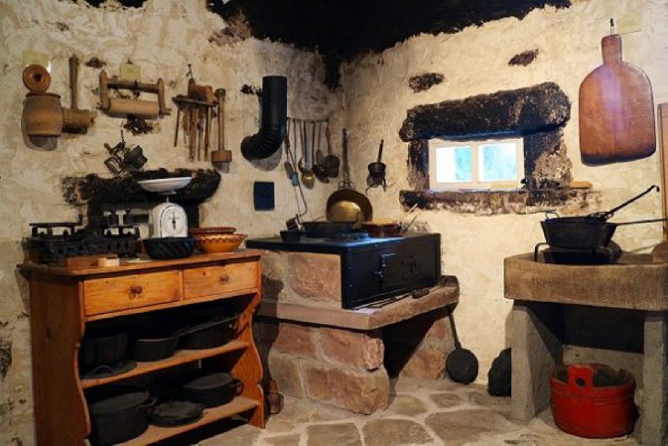 Unter dem Rauchfang steht ein ursprünglich gemauerter, später ein eiserner Tischherd. In der Küche befindet sich auch das Feuerloch, durch welches mit “Reiswellen” der Kachelofen in der Stube beheizt wurde. In Verbindung mit dem Küchenherd wird im Strohflechtzimmer eine Kachelwand beheizt. Diese sogenannte “Kunst” war eine wärmende Wand. Der Rauch wurde durch Züge in der hohlen Wand über Kopfhöhe wieder in das Küchengewölbe zurückgeleitet. Für den Kachelofen galt das gleiche Funkt!onsprinzip.