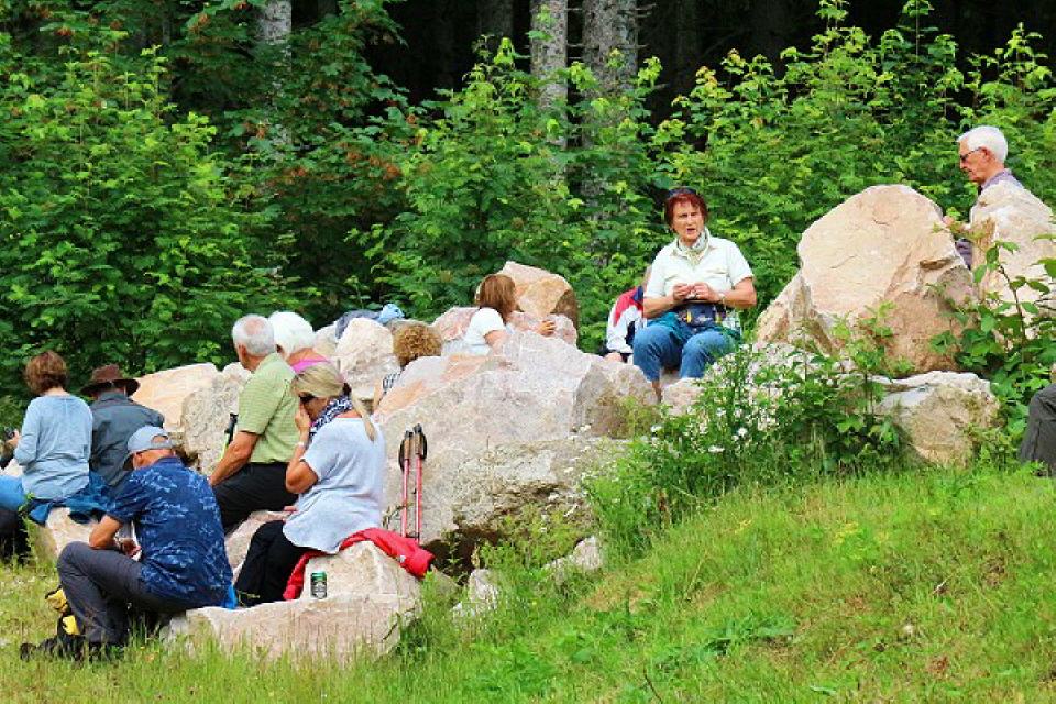4. Altarstein. Wir blicken zu diesen Stein hinauf. Der Felsen ruht erhaben auf einem großen Granitblock. Er kann fast rundum begangen werden. Wäre hier kein Wald angepflanzt, läge dem Betrachter Schonach zu Füßen. Aufgrund seiner außergewöhnlichen Lage kommt ihm besondere Bedeutung zu. Der Stein enthält westlich eine Sitzschale und talseitig drei stufenförmig angeordnete Wasserschalen mit einem Auslauf.