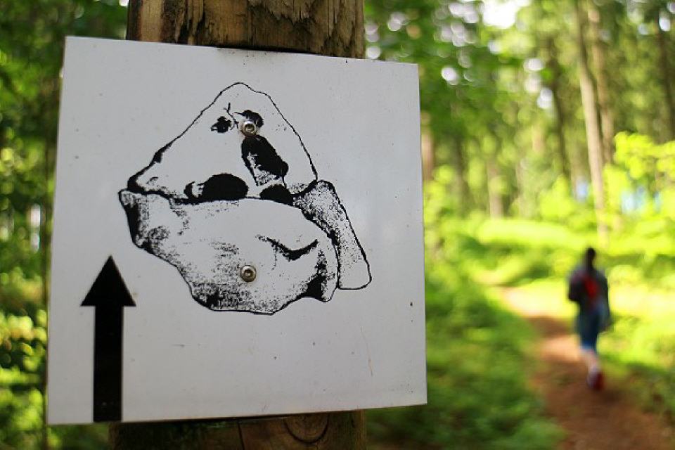 2. Teufelstritt. Fast in Sichtweite des Einganges zum Naturerlebnispfad, 300 m nordöstlich, treffen wir auf die größte bekannte ovale Schale. Sie hat eine Ausdehnung von etwa 85 auf 65 cm. Besonders markant ist ihr flacher Boden und die scharfen Außenkanten. Ausgelöst durch die ständig fortschreitende Verwitterung bewegen sich viele solcher Brocken.