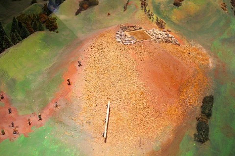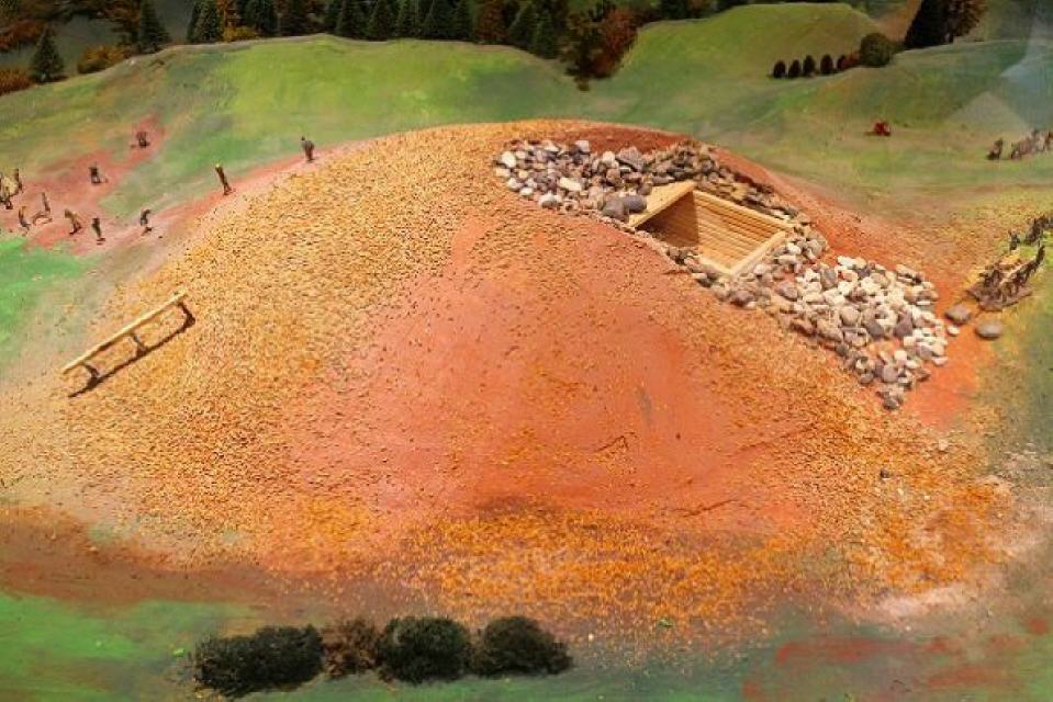 Jetzt begannen die Grabbauer, den Hügel aufzuschütten. Sie deckten die Kammer mit den herbeigeschleppten Steinen zu. Dieser Steinkegel war schließlich 3,5 m hoch und hatte einen Durchmesser von 40 Metern. Die ungleichmäßige Oberfläche dichteten sie mit Grasschollen ab. Nun mühten sich die Menschen etwa 15 Jahre lang: Korb für Korb trugen sie Erde zum Grab und mit jedem Korb wuchs der Grabhügel. Endlich war er so hoch, daß er wie ein Berg sichtbar dastand. Die Arbeit war für die Kelten sehr wichtig. Die Grabesruhe ihres Fürsten schenkte ihnen die Zuversicht, das Leben ihres Anführers auch nach dem Tod geschützt zu haben.