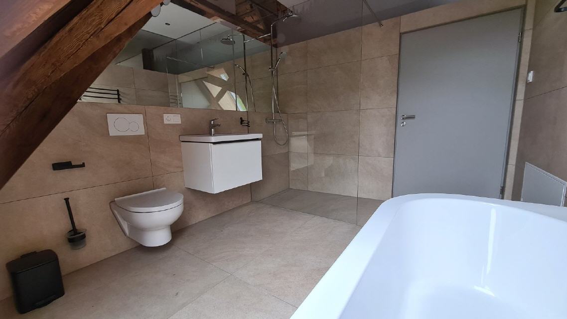 - Badezimmer: WC, Waschbecken mit Spiegel, Badewanne, Dusche, Hocker