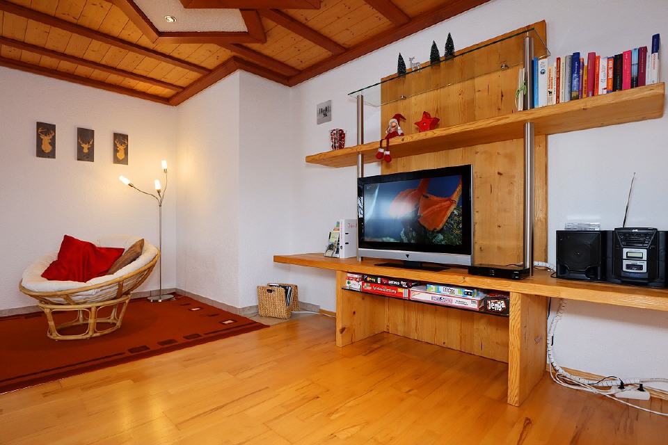 - Wohnzimmer: geräumig, separate Leseecke, gemütliche Couchgarnitur, Tisch, Regalwand, Flachbild-TV, Radio / CD-Player, Schreibtisch mit Leselampe und Stuhl, Zugang zum Balkon