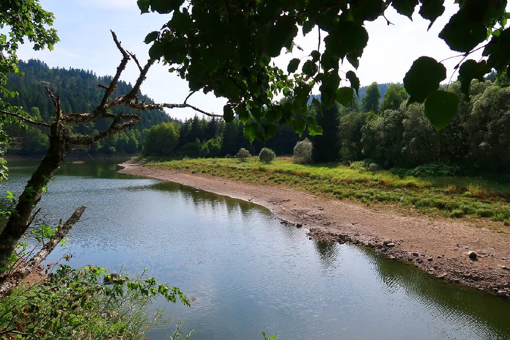 Dann bleibt man auf der rechten Seite des Ufers und beginntden See zu umrunden. Wenig später erreicht man eine Kneipp-Anlage am Albstausee, die versteckt im Wald einen Blick auf den See gewährt. Hier kann man die Füße im Wasser abkühlen und die Waldluft genießen. Erholt geht es weiter den Seerundweg entlang bis zur Staumauer.