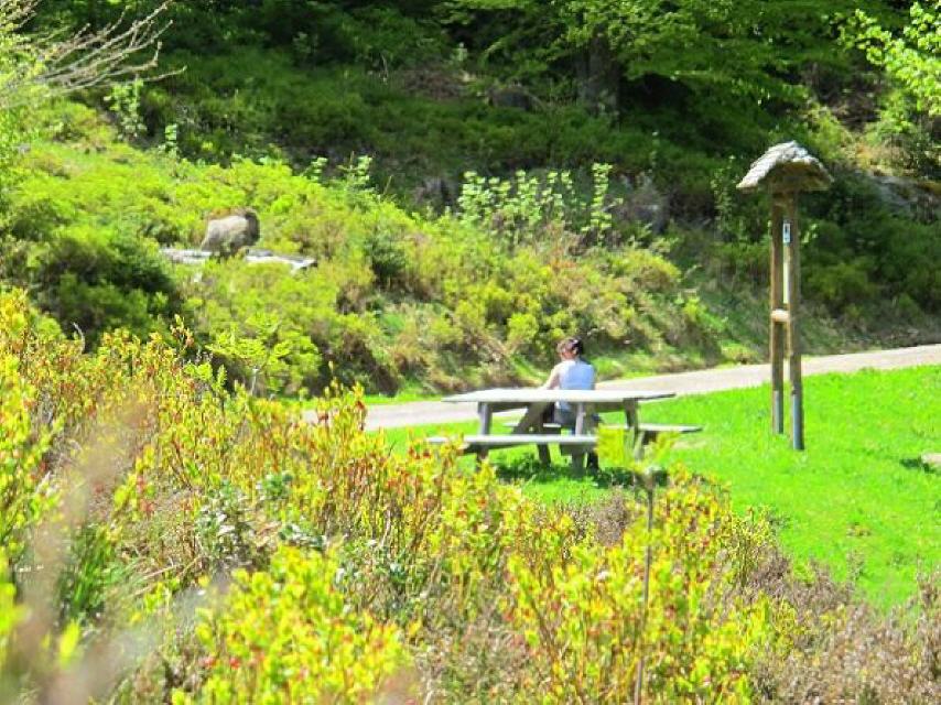 Ein Rastplatz lädt ein, sich die Kluse näher anzuschauen. Nach einer kurzen Pause passieren wir die drei End-Moränen. Wir halten uns westlich der Alb und erreichen die Abzweigung „Schesslong dü Boah“. Über einen schmalen Wiesenpfad kommen wir zu einem Waldsofa und der Knüppelcouch „Schesslong dü Boah“.