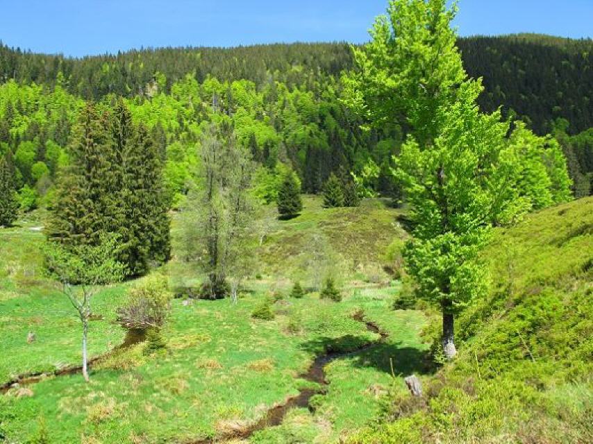 Nach wenigen Metern öffnet sich der Wald und gibt einen herrlichen Blick frei ins Klusenbachtal. Vorbei an einem alten Köhler-Platz geht es talabwärts.