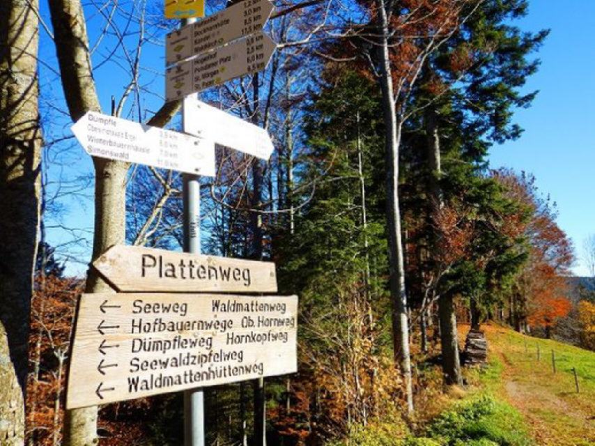 Von dort aus geht es zu Fuß über die Hochebene mit bestem Blick über die Rheinebene bis hinüber zu den Vogesen. Nach knapp über 3 km erreichen Sie den Plattenhof, eine Gastwirtschaft; einige 100 Meter darunter liegt in einer Mulde der Plattensee, 840 Meter westlich und flussaufwärts der Zweribachwasserfälle.