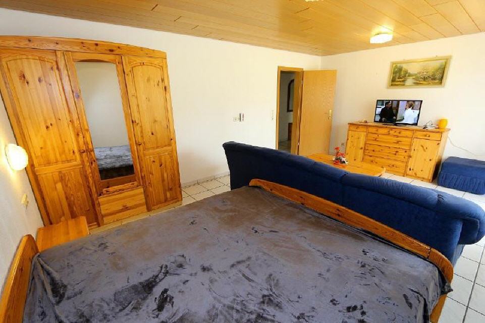 Auch diese Ferienwohnung liegt ebenerdig und hat einen separaten Eingang. Die Fewo hat eine Wohnfläche von 67 qm und bietet Platz für bis zu 5 Personen. Die Fenster haben Rolläden. Die moderne Einbauküche verfügt über Essecke, Mikrowelle Toaster Elektro- und Holzgrill. Das Bad mit Dusche hat Badewanne mit Haltegriffe, WC und Waschmaschine. Genießen Sie Ihren Urlaub auch auf der großen Terrasse, freuen Sie sich auf die Spiel- und Liegewiese mit Liegestühle und Gartenmöbel. Das Wohnzimmer hat Ess- und Couchecke, die eine weitere Schlafmöglichkeit bietet. Ihnen steht ein Sat-TV zur Verfügung. Die Wohnung hat 2 Schlafzimmer: