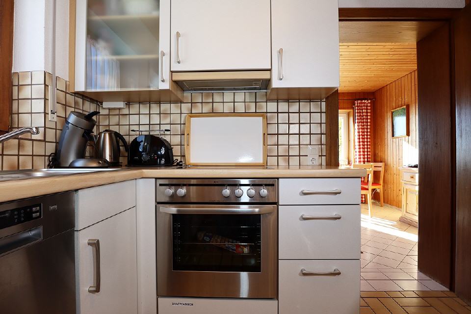 - moderne Küche (komplett eingerichtet mit Kaffeemaschine, Wasserkocher, 4-Feld-Glaskeramik-Herd, Mikrowelle, Backofen, Spülmaschine, Kühlschrank mit 3-Sterne-Gefrierfach)