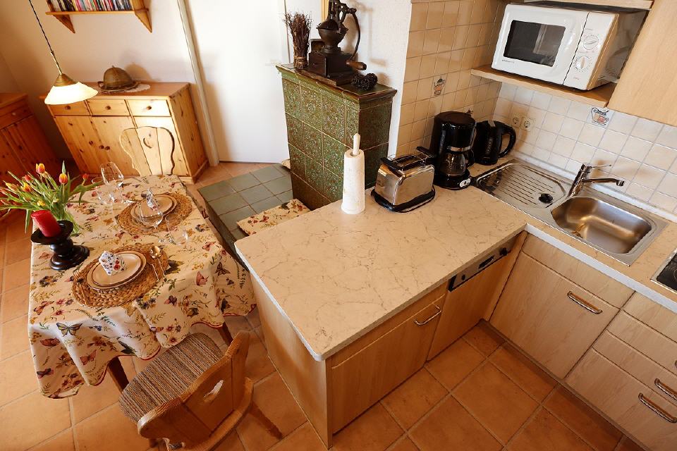 - komplett eingerichtete Küchenzeile unter anderem mit Kaffeemaschine, Wasserkocher, 4-Feld-Glaskeramik-Herd, Mikrowelle, Spülmaschine, Kühlschrank mit 3-Sterne-Gefrierfach