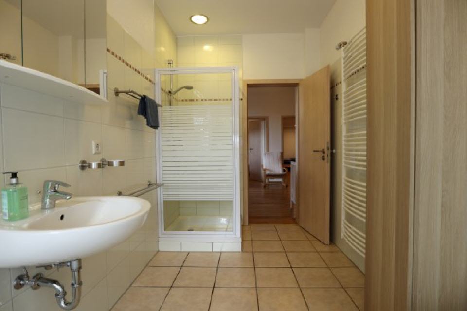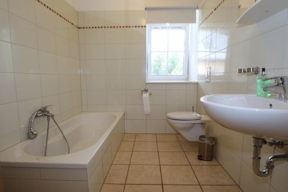 - großes Badezimmer mit Badewanne, Dusche und WC und separate Dusche mit WC
