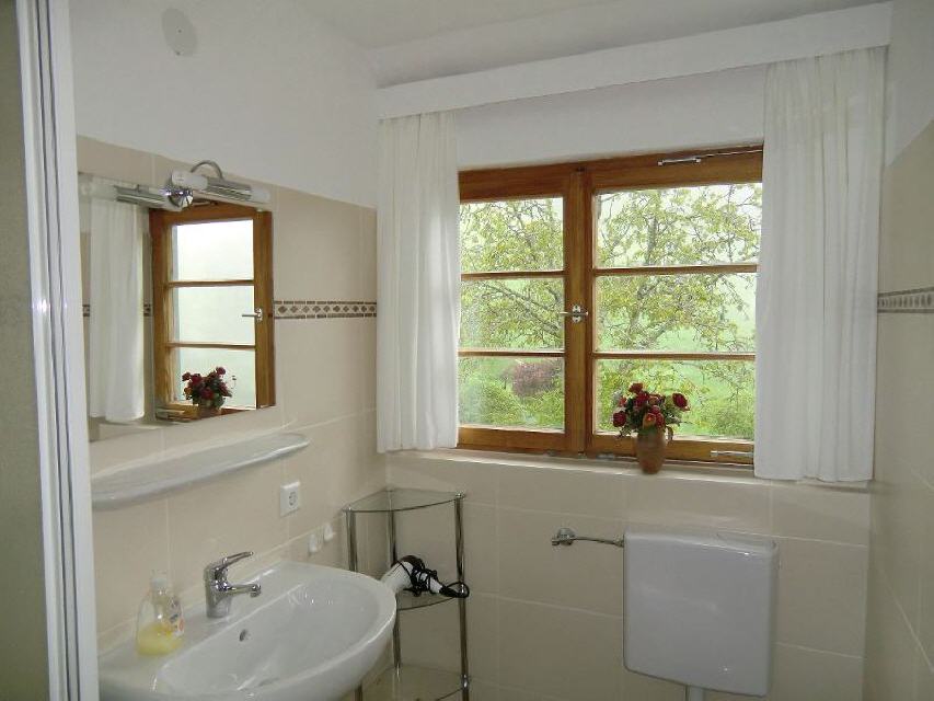 Das Bad bietet Dusche und WC. Fön und Handtücher sind vorhanden.