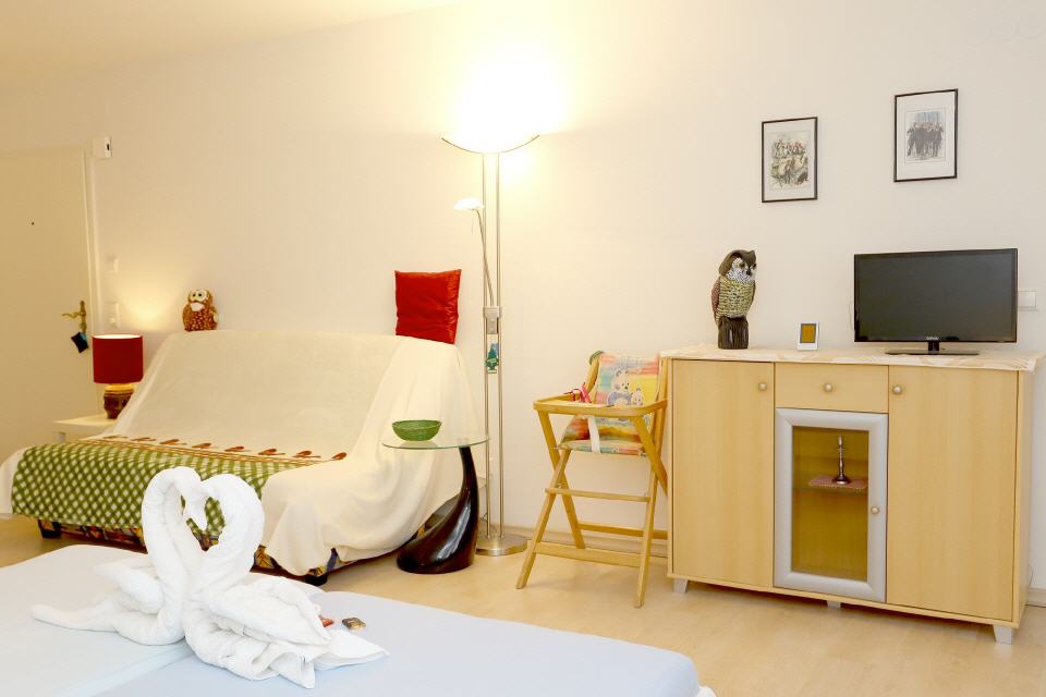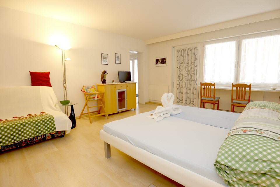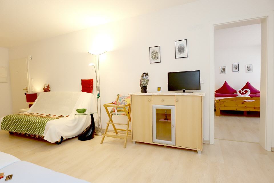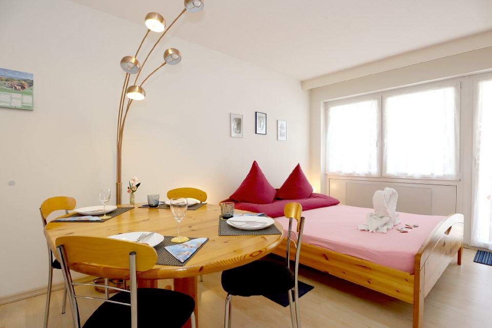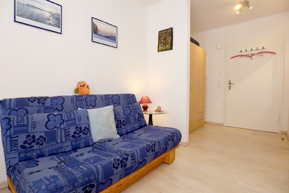 • Wohnbereich: Schlafsofa, Esstisch, TV Digital