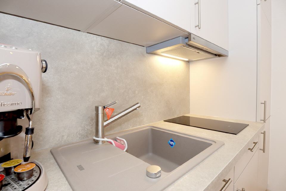 • Küche: Kühlschrank, Kochtöpfe, Geschirrspüler, Esstisch, Toaster, Kaffeemaschine, Geschirr und Besteck, Wasserkocher, Küchenzeile, 3-Plattenherd, Gefrierfach