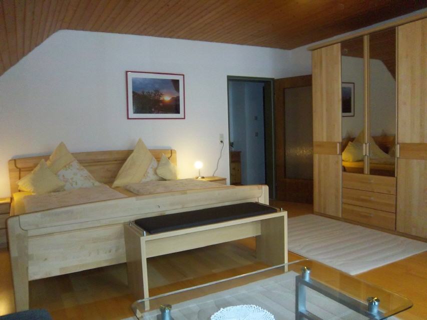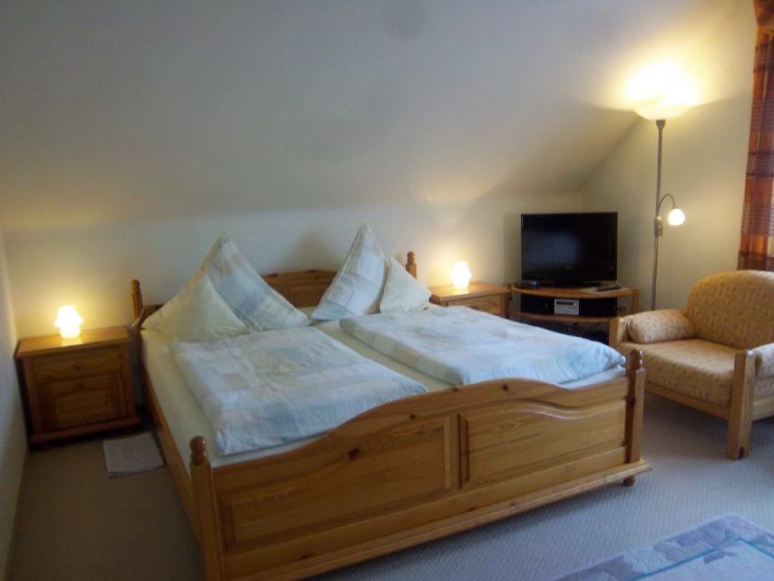 Schlafzimmer mit großer Wohnecke und Sat-TV