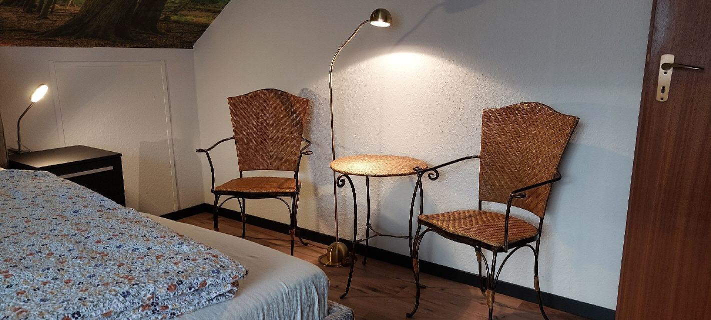 Ihnen stehen zwei Schlafzimmer zur Verfügung, auf Wunsch mit Kinderbett. Sie sind geräumig eingerichtet mit Doppelbetten, Nachttischen, Nachtleuchten, Kleiderschrank und Sitzgelegenheiten.
