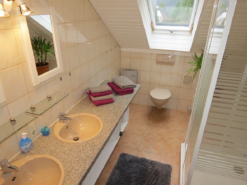 Keine Wünsche lässt ebenso das Bad offen. Es hat einen Waschtisch mit zwei Becken, eine große Ablage, zwei Spiegel sowie einen Kosmetikspiegel. Die Ablage eignet sich ebenso zum Wickeln von Babys. Außerdem finden Sie ein WC sowie eine Dusche vor.