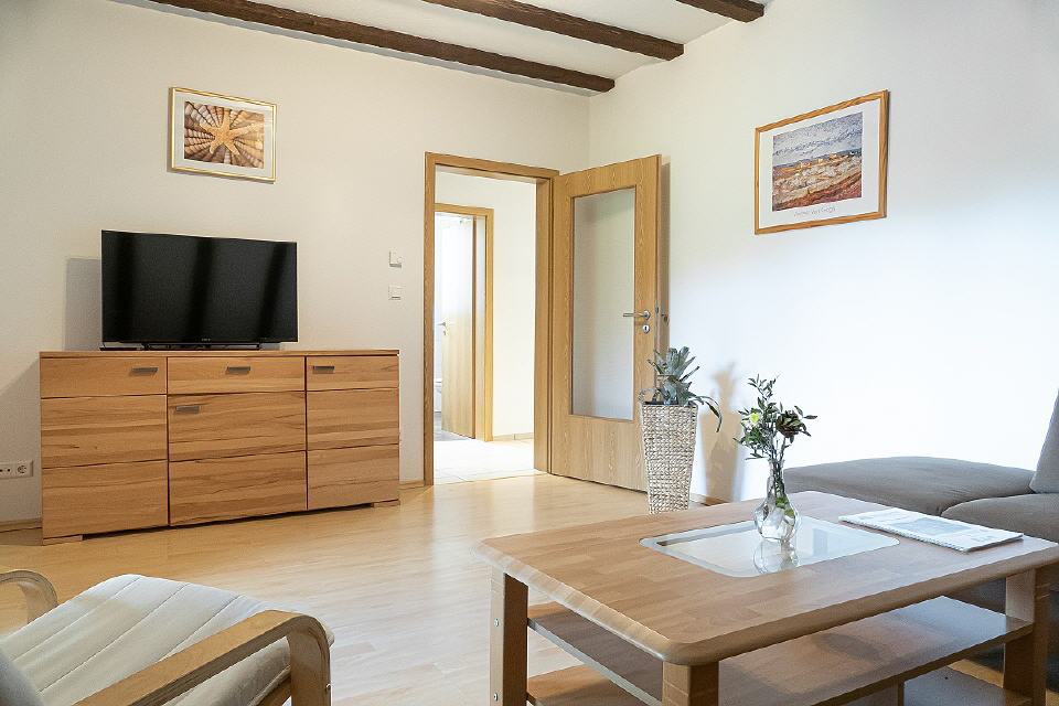 1.OG: 3-Zimmer-Appartements für bis zu 5 Personen. Wohnfläche 85 qm: Wohnraum, 2 separate Schlafzimmer, Küche inkl. Spülmaschine, Dusche, separates WC, großer Balkon am Wohnraum.