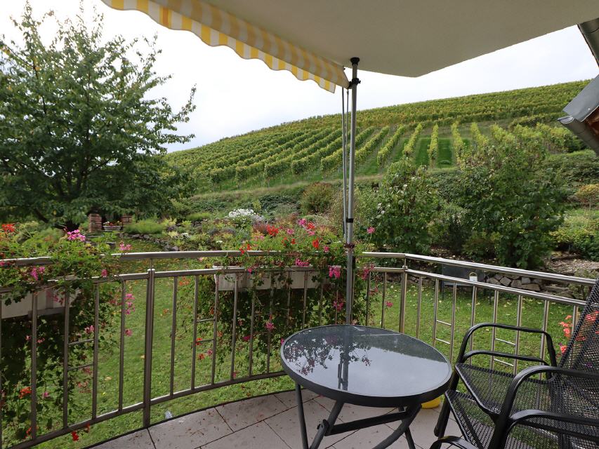 - Ferienwohnung 2 Weinbergblick: Die Ferienwohnung liegt im EG links, südöstlich zur Talseite. Vom großen Balkon (12 qm) hat man einen herrlichen Ausblick.