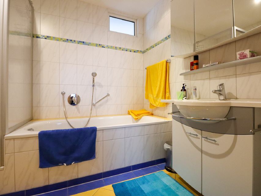 - modernes Bad mit Dusche, Badewanne, WC und Bidet, Fön