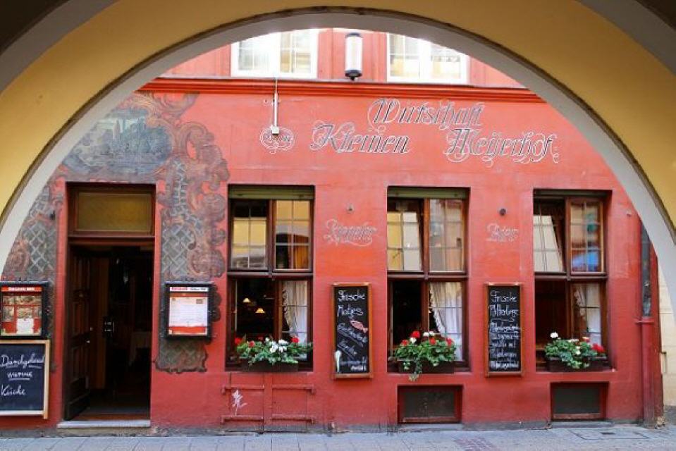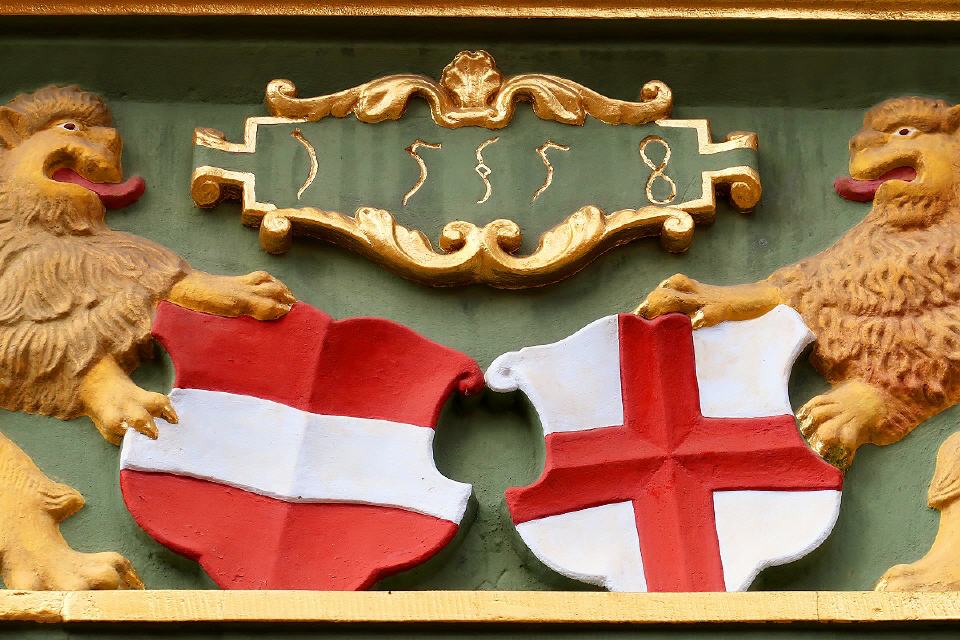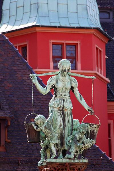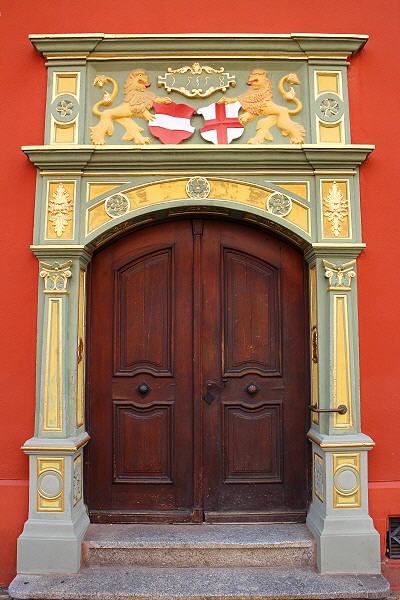 Gegenüber liegt das 1557 bis 1559 erbaute ziegelrote Alte Rathaus, das nach der Zerstörung 1944 im ursprünglichen Stil wieder errichtet wurde.