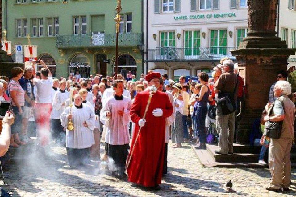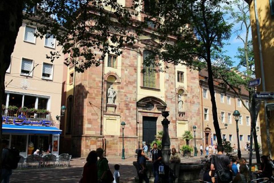 1529 war das Basler Domkapitel vor den Schweizer Reformatoren hierher geflüchtet. Von da aus sind es nur wenige Schritte zum Kartoffelmarkt, dessen neugotischer Brunnen von den Ständen “fliegender Händler” umgeben ist mit einem vielfältigen Angebot an Schmuck, Lederwaren, textilen Produkten oder Kerzen. Der Blick über die Handwerkerstände führt auf das rote Gebäude der Sparkasse. Von der anderen Seite, der Franziskanerstraße, ist in diesen Bau das “Haus zum Wallfisch” einbezogen, eines der schönsten spätgotischen Bürgerhäuser Freiburgs.