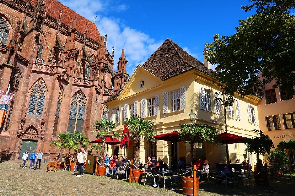 Die Südseite des Münsterplatzes wird von der prächtigen, rot leuchtenden Fassade des historischen Kaufhausers bestimmt. Das 1532 fertiggestellte Gebäude gilt als schönster Profanbau Freiburgs und ziert nicht nur zahllose Ansichtskarten und Souvenirs. In traditioneller Freiburger Bauweise zeigt die Traufseite zum Platz hin. Nur wenige Meter davon entfernt steht das “Haus zum schönen Eck”, eines der schönsten erhaltenen Bürgerhäuser des 18. Jahrhunderts, das nach seinem Erbauer, dem Barockkünstler Christian Wentzinger (1710 – 1797), auch “Wentzingerhaus” genannt wird.