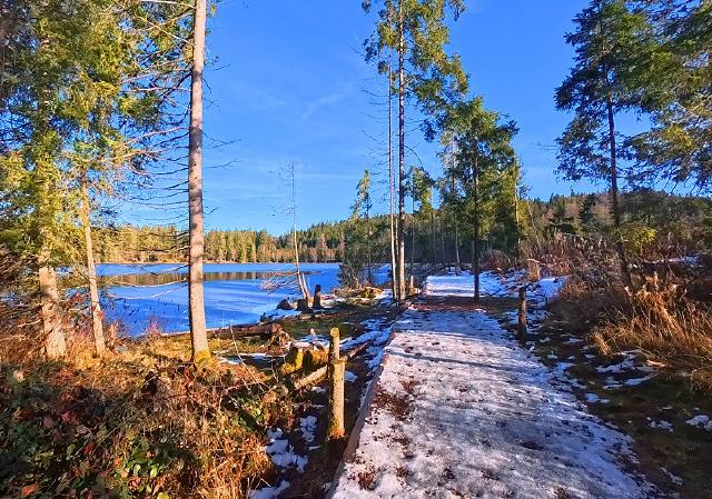 Eine wunderschöne Rundtour bietet sich Naturverbundenen bei Altglashütten und Falkau am Feldberg an. Der Weg eignet sich sogar in der verschneiten Winterlandschaft. Er misst etwa 6 km, startet beim Bahnhof und führt bis zum Windgfällweiher, einem kleinen, idyllisch gelegenen See im Hochschwarzwald. Bild antippen!