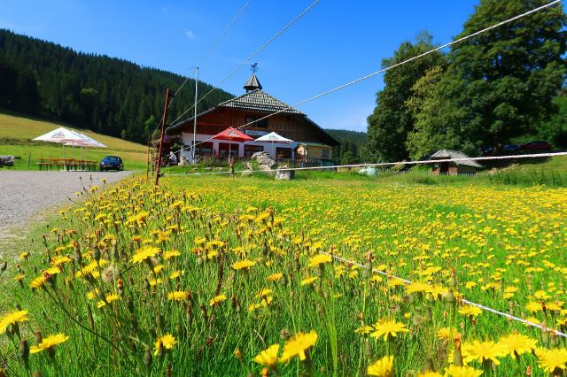 Eine andere Möglichkeit ist, den Philosophenweg rechts liegen zu lassen und ein kleines Stück talwärts in Richtung Bärental, jedoch nach Neuglashütten abzubiegen. Es dauert nicht lange, dann öffnet sich der Wald in eine herrliche Bergwiesenlandschaft. Neuglashütten ist erreicht. Am Ende des kleinen Ortes rechts über eine Kuhweide geht es in Richtung B 500 und Altglashütten weiter.