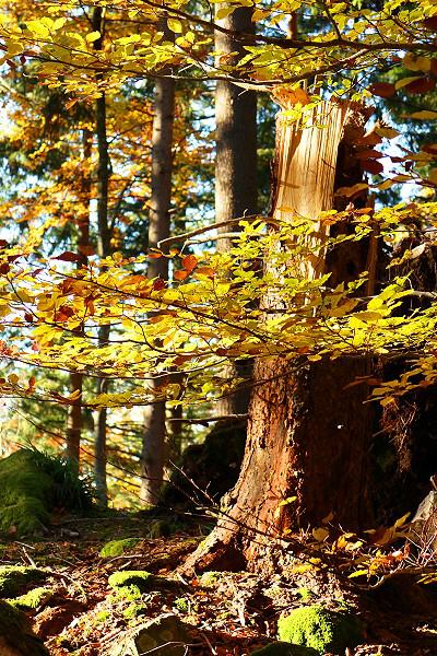 Weiter geht es leicht abwärts nach Westen in Richtung Buchenbach – Himmelreich und passieren den Hirschsprung. Vom Höhenweg aus ist er leider nicht zu sehen. Der Hirschsprung verdankt seinem Namen einer Sage. Demnach begab sich der Ritter der Burg Falkenstein auf Hirschjagd. Nach einiger Zeit entdeckte er einen prachtvollen Hirsch, doch dieser, getrieben von Todesangst, entkam dem Jäger mit einem gewaltigen Satz über die Schlucht. Damals war die Schlucht an dieser Stelle nur neun Meter Breit; im Zuge des Straßenbaus wurde die Engstelle später vergrößert. Die größte Erweiterung wurde schon 1638 von 2000 französischen Soldaten gemacht.