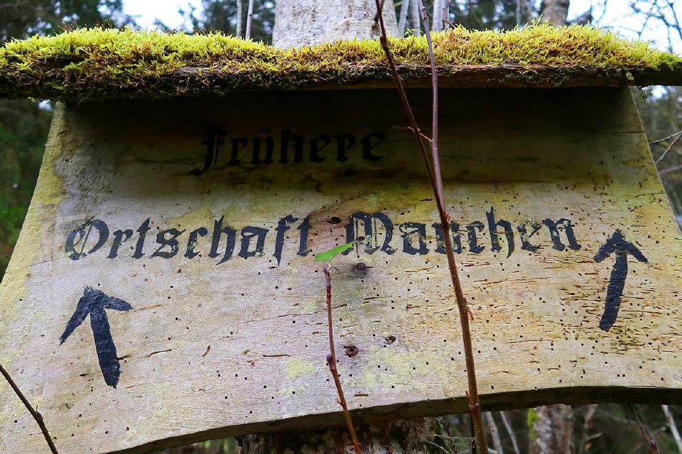 Nach der Unterführung rechts halten. Es kommt ein Fahrweg, dort links einbiegen und weiter rechts neben dem Bach. Nach einem Kilometer wird die Fahrbrücke der Untermauchen erreicht. Diese Brücke nicht überqueren, sondern weiter rechts dem Bach entlang. Ein Schild „frühere Ortschaft Mauchen“ erinnert an das vor etwa 500 Jahre aufgegebene Dorf Mauchen.