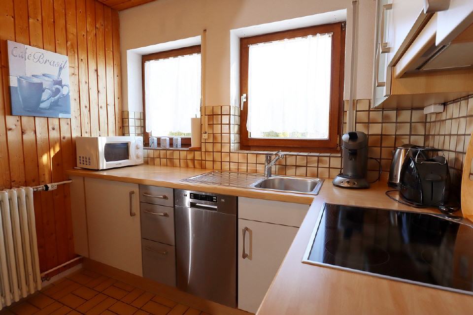 - moderne Küche (komplett eingerichtet mit Kaffeemaschine, Wasserkocher, 4-Feld-Glaskeramik-Herd, Mikrowelle, Backofen, Spülmaschine, Kühlschrank mit 3-Sterne-Gefrierfach)