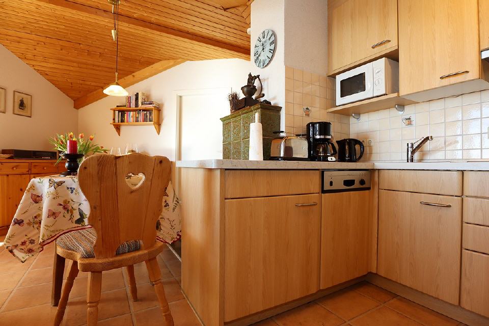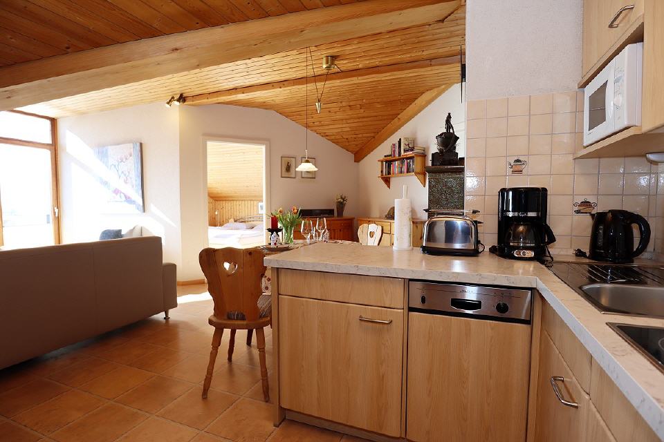 - komplett eingerichtete Küchenzeile unter anderem mit Kaffeemaschine, Wasserkocher, 4-Feld-Glaskeramik-Herd, Mikrowelle, Spülmaschine, Kühlschrank mit 3-Sterne-Gefrierfach