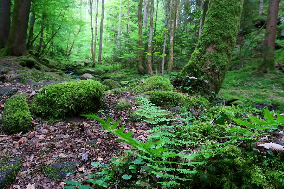 Die wilde Monbachschlucht bei Bad Liebenzell ist ein Erlebnis besonderer Art und sollte bei einem Urlaub im Nordschwarzwald nicht fehlen. Der Weg führt über schmale Pfade, umgestürzte Baumstämme, vorbei an sattgrünen Flussauen, glitzernden Bächen, wilden Felsformationen und einem echten Wasserfall. Den Monbach quert man über moosbewachsene Felsbrocken. Wer an manchen Stellen nicht aufpasst, läuft Gefahr nasse Füße zu bekommen.